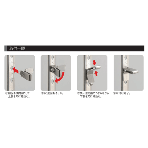 そして棚受けを90度回転させ、棚受けを指でつまみながら下側を穴に押し込みます。