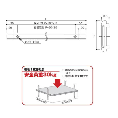 商品名 アルミ製 フラッシュ棚柱 ブラック 品番 KTR-4FB 寸法 14mmx3.5mm 厚さ 3.5mm 棚受ピッチ 20mmx89 ビス穴 3.0mm-6.0mm サラ穴 P160mmx11 長さ 1820mm (※多少の誤差がございます) 材質 本体 : アルミ押出型材 化粧カバー : 硬質塩化ビニル 表面 本体 : B2アルマイト(シルバー) 化粧カバー : ブラック 専用棚受 KTR-24B 棚受 ブラック(別売です) 専用キャップ KTR-34B エンドキャップ ブラック(別売です) 付属品 この商品に付属品はございません ※取付ビスは別売りとなります。
